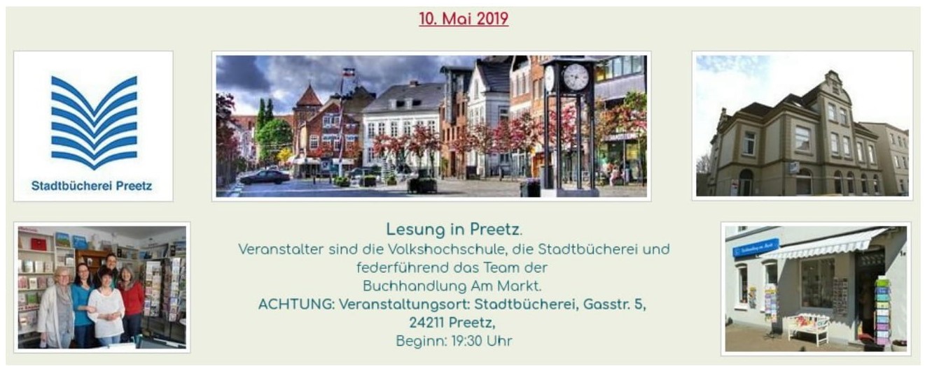 Für Eulen aus Kiel und dem Umland: Am Freitag, dem 10. Mai, komme ich nach Preetz. Um 19:30 Uhr lese ich in der dortigen Stadtbücherei (Gasstr. 5, 24211 Preetz) aus meinem Küstenkrimi "Blutmöwen" und nach der Pause die ShortStory "Dunkles Wasser", mit der ich den 1. Preis des NordMord Award gewonnen habe.