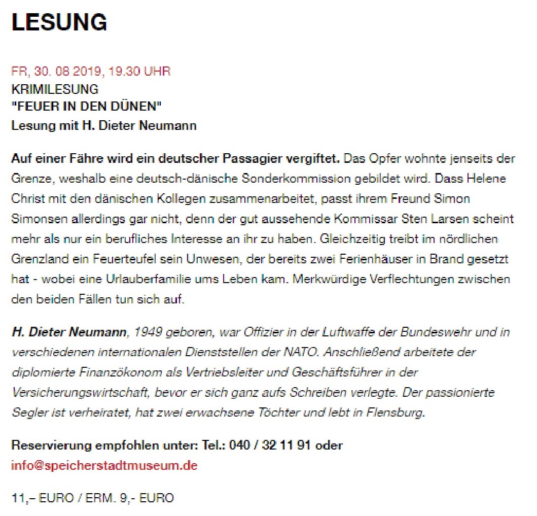 Die allererste Lesung aus dem neuen Helene-Christ-Krimi "Feuer in den Dünen" halte ich diesmal am 30. August 2019 in Hamburg, und zwar in einer ganz besonderen "Location", dem Speicherstadtmuseum. Ich würde mich riesig freuen, wenn auch ein paar Eulen aus Hamburg und Umgebung den Weg dorthin fänden, und freue mich auf euch!