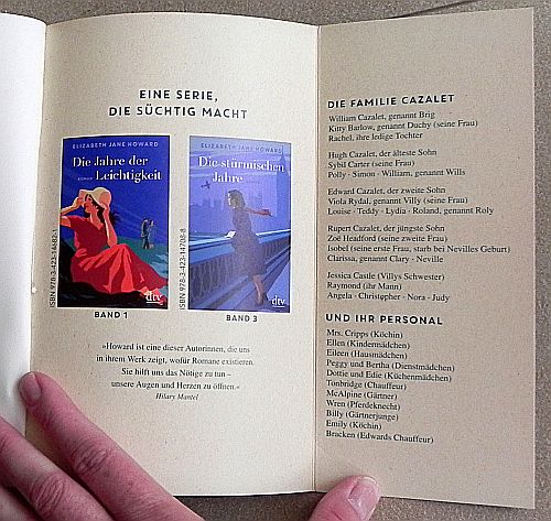 Elizabeth Jane Howard: Die Zeit des Wartens. Die Chronik der Familie Cazalet, Teil 2, Roman, OT: Marking Time, aus dem Englischen übersetzt und mit Anmerkungen versehen von Ursula Wulfekamp, München 2018, dtv Verlagsgesellschaft, ISBN 978-3-42-314683-8, Klappenbroschur, 605 Seiten, Format: 13,4 x 4,5 x 20,8 cm, Buch: EUR 16,80 (D), EUR 17,40 (A), Kindle: EUR 14,99.