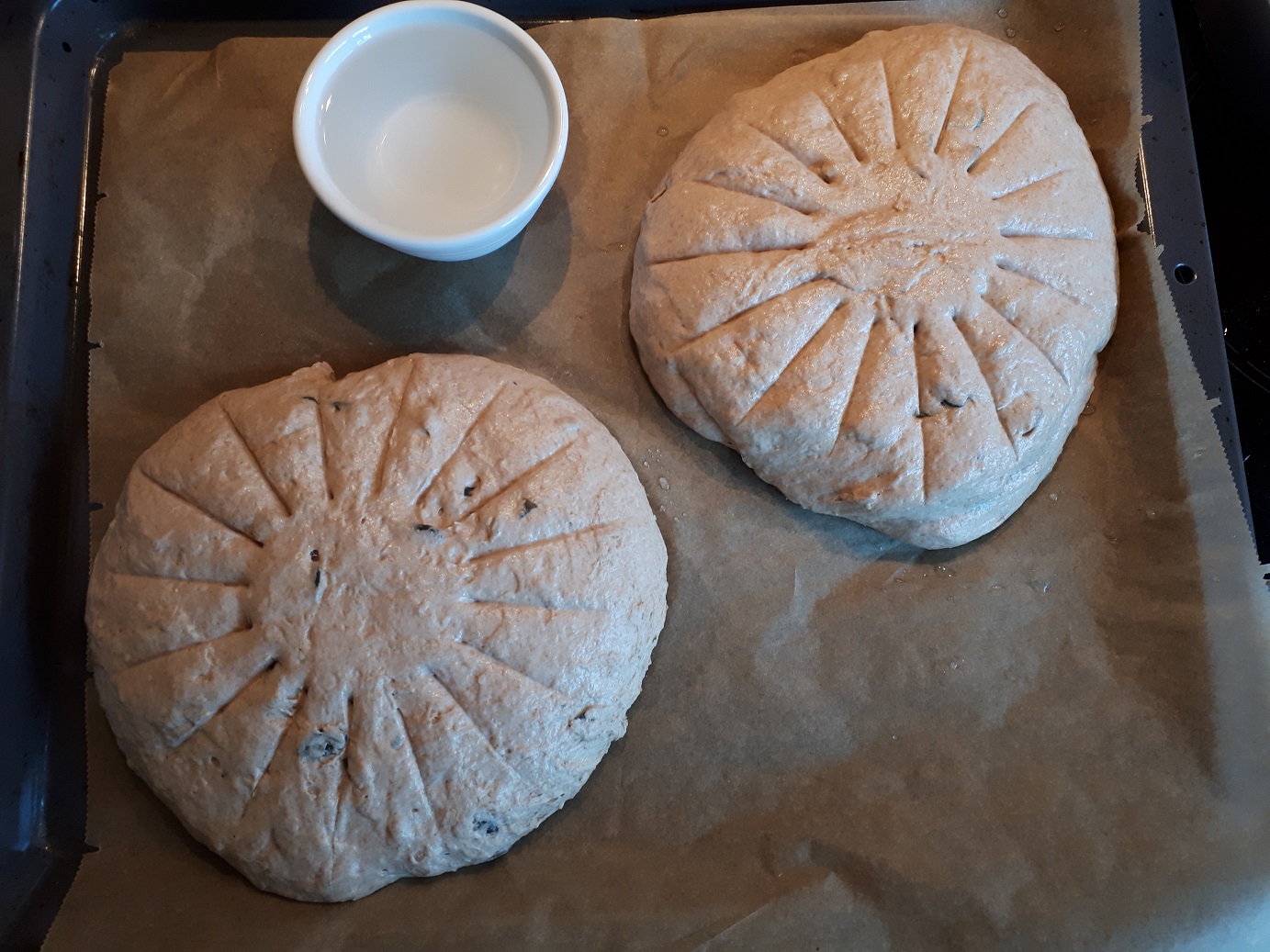 Zubereitung: Ich hab das kneten der Küchenmaschine überlassen. Der Teig stand dann ca. eine halbe Stunde auf der Terrasse in der Sonne. Wirklich nochmal geknetet habe ich ihn nicht. Habe den klebrigen Teig nur irgendwie auf das Backpapier bugsiert und dann mit feuchten Händen geformt.