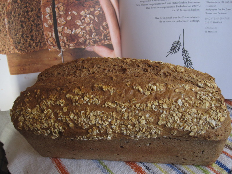 Der Teig hatte eine sehr schöne Konsistenz. Beim letzten Gehen habe ich dem Teig aber etwas Wärme gegeben. Das Backen mit Dampf habe ich mir gespart. Trotzdem ist das Brot schön locker geworden. Ich finde es lustig, dass auf dem Bild im Backbuch Sesam auf dem Brot ist, der gar nicht aufgeführt ist.