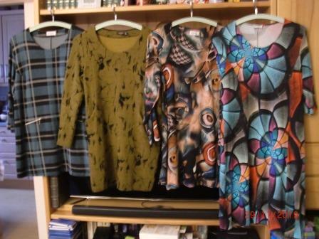 Es gibt Kleider und Jersey-Shirts in allen möglichen Farben und Längen - mir stehen dunklere Farben besser -, die ich gut zu Leggings oder schmalen Hosen tragen kann oder auch so als Kleid.