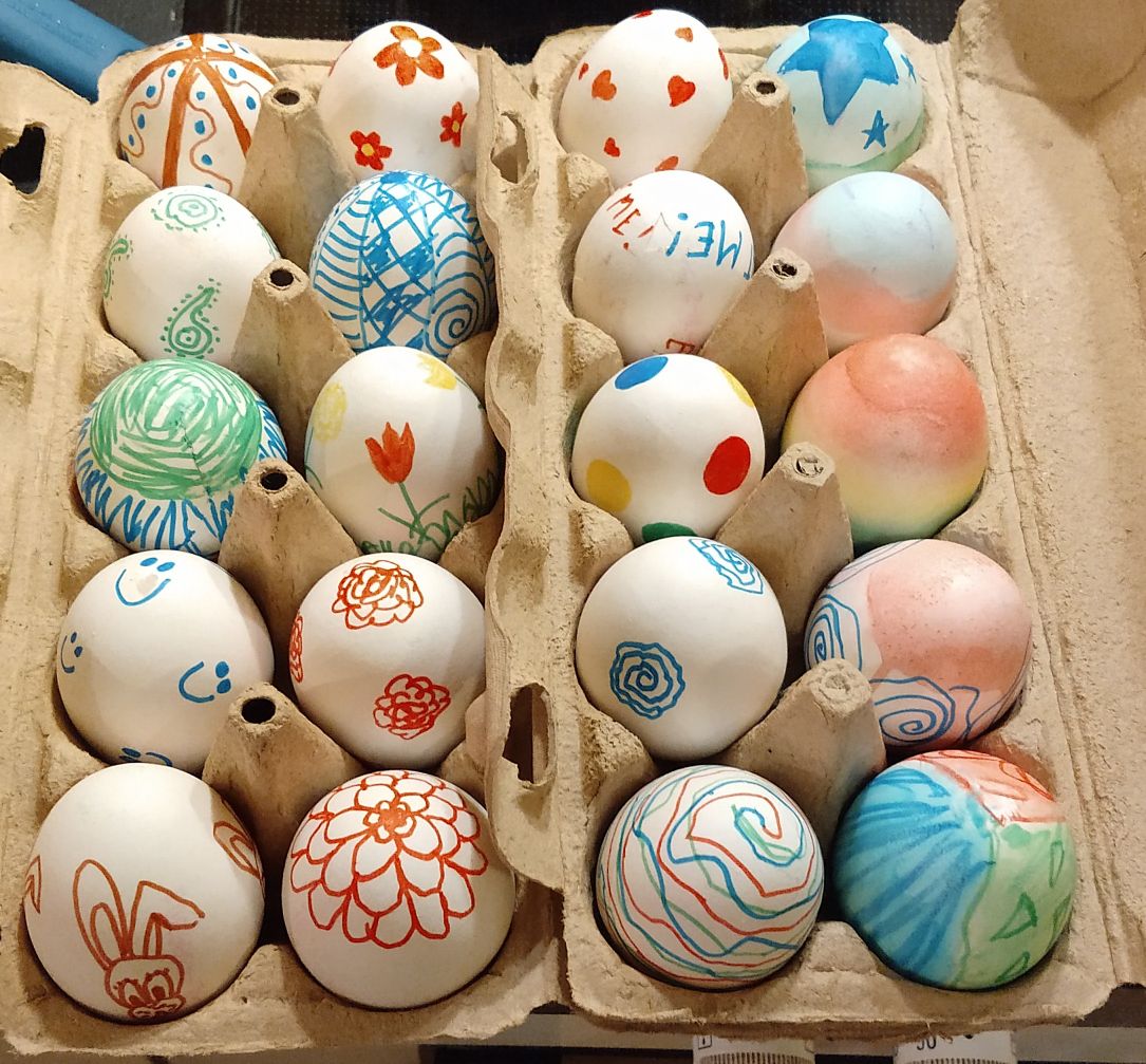 Eier für morgen anmalen. Kleines Kind hatte keine Lust, großes Kind wollte "Mal was anderes" (nutze sonst die Farben, die man mit Handschuhen verteilt). Nach sechs Eiern (Reihe ganz rechts und vorne Mitte rechts) war die Lust auch weg und ich musste alleine weiter malen... Sind eine Art Filzstifte mit Lebensmittelfarbe gefüllt, die habe ich vor Jahren gekauft als die Kinder noch klein waren und sie trocknen seltsamerweise nicht aus.