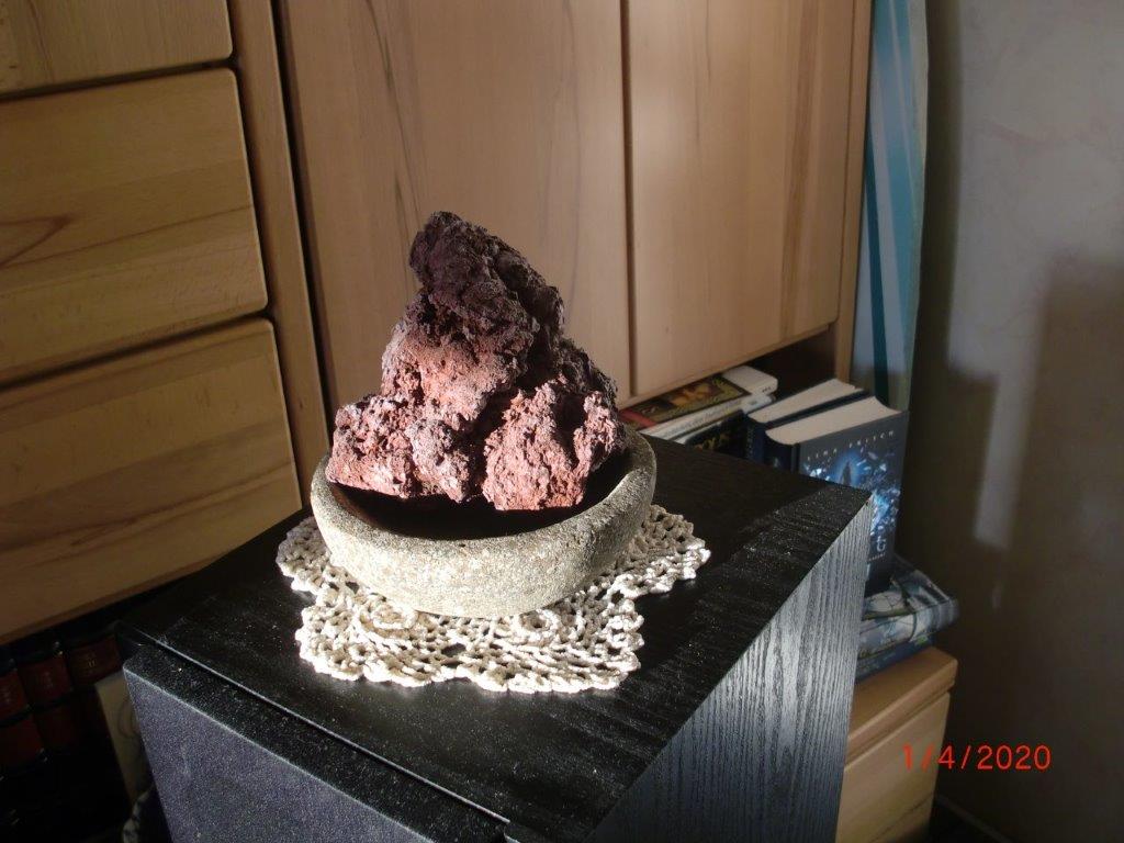Letztes Jahr bekam ich ja von meinem Chef aus seinem Lanzarote-Urlaub einen tollen roten Lavastein geschenkt. Jetzt kaufte ich eine Basanit-Schale, da kam der Stein rein und steht auf der Lautsprecherbox.