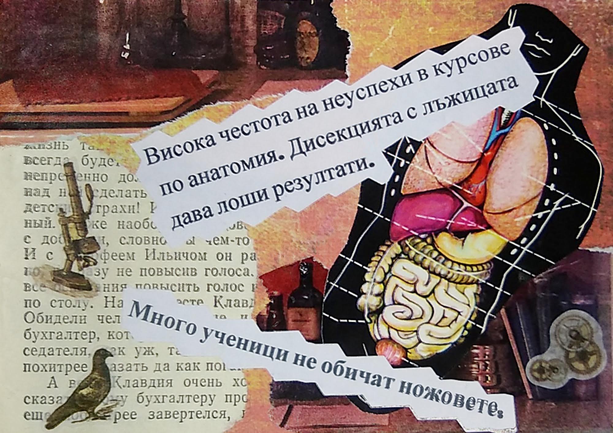 Das hier z.B. ist entstanden für eine Nonsens-Kartenrunde zum Thema "Lost in Translation", wo die Organisatorin einen Satz so oft durch Google Translator geschickt hat, bis schließlich auf Bulgarisch "Many students don't like knives" herauskam - der Einzeiler auf der Karte. Der andere Text stammt von mir und bedeutet ungefähr "Hohe Durchfallquote in Anatomie-Kursen. Sezieren mit dem Löffel führt zu unbefriedigenden Ergebnissen." Frag nicht nach dem Sinn - es gibt keinen...