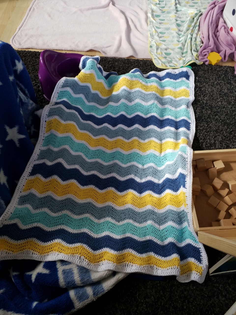 Bei mir ist gestern die gehäkelt Babydecke für Nr. 2 fertig geworden, nachdem ich vor etwa 5 Wochen nochmal neu angefangen habe, weil ich mit der vorherigen Idee unzufrieden war. Die Blautöne sind aus der gleichen Wolle wie auch schon die Decke für unsere Große (so als Verbindung fand ich das nett) und das Gelb hat sie für ihr Geschwisterchen dazu selber ausgesucht (sie hat Lila als Kontrast) , ganz am Anfang der Schwangerschaft.