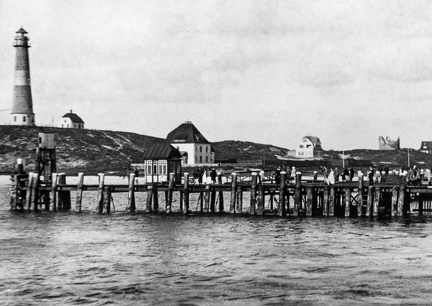 Auf diesem Foto blickt man von der alten Seebrücke, die bis kurz nach dem 2. WK bestand, zum Leuchtturmwärterhaus und auf den erwähnten Wasserturm, der bereits als Ruine erbaut wurde, rechts im Bild.