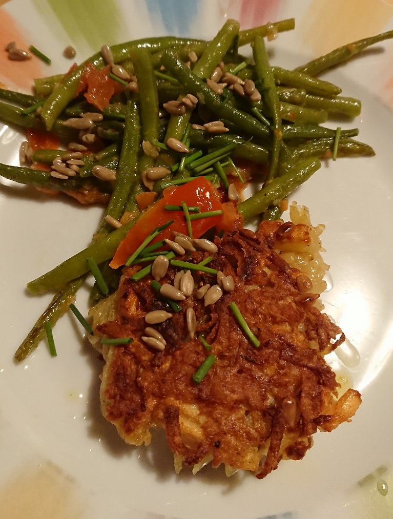 Heute gab es was von HF nachgekocht: Rösti mit Bohnengemüse. War sogar vegan. Hat man gar nicht bemerkt. :lache