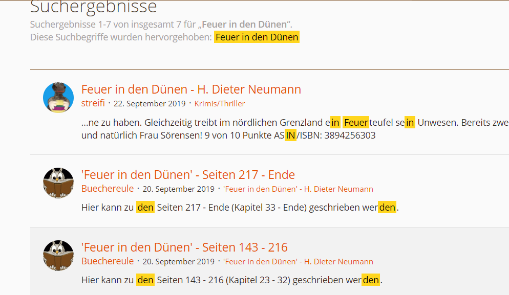Wegen des Findens der Rezis: Ich mach das immer so, dass ich die erweiterte Suche aufrufe und nach dem Titel des Buches suche. Dabei hake ich immer an, dass nur der Betreff durchsucht werden soll.