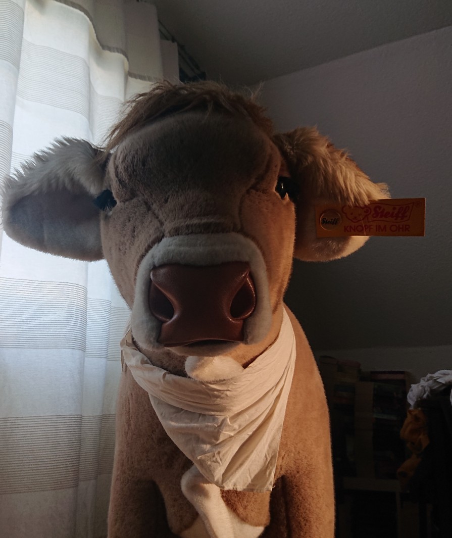 Guten Morgen... ich habe vor vielen Jahren neben meinem regulären Job noch in einer Kneipe und in einem Modegeschäft gearbeitet und hatte ein Jahr lang keinen Urlaub. Zu Weihnachten gab es in einem großen Kaufhaus eine Dekoration mit Studio Tieren von Steiff in Form eines Bauernhofs mit Kühen, Kälber, Ziegen Eseln und so weiter... ich habe mich in ein Kälbchen schockverliebt und konnte es kaufen. Das war zu dieser Zeit sehr ungewöhnlich. Seitdem begrüßt es mich jeden Morgen wenn ich die Augen aufmache, denn es steht in meinem Schlafzimmer 🐂
