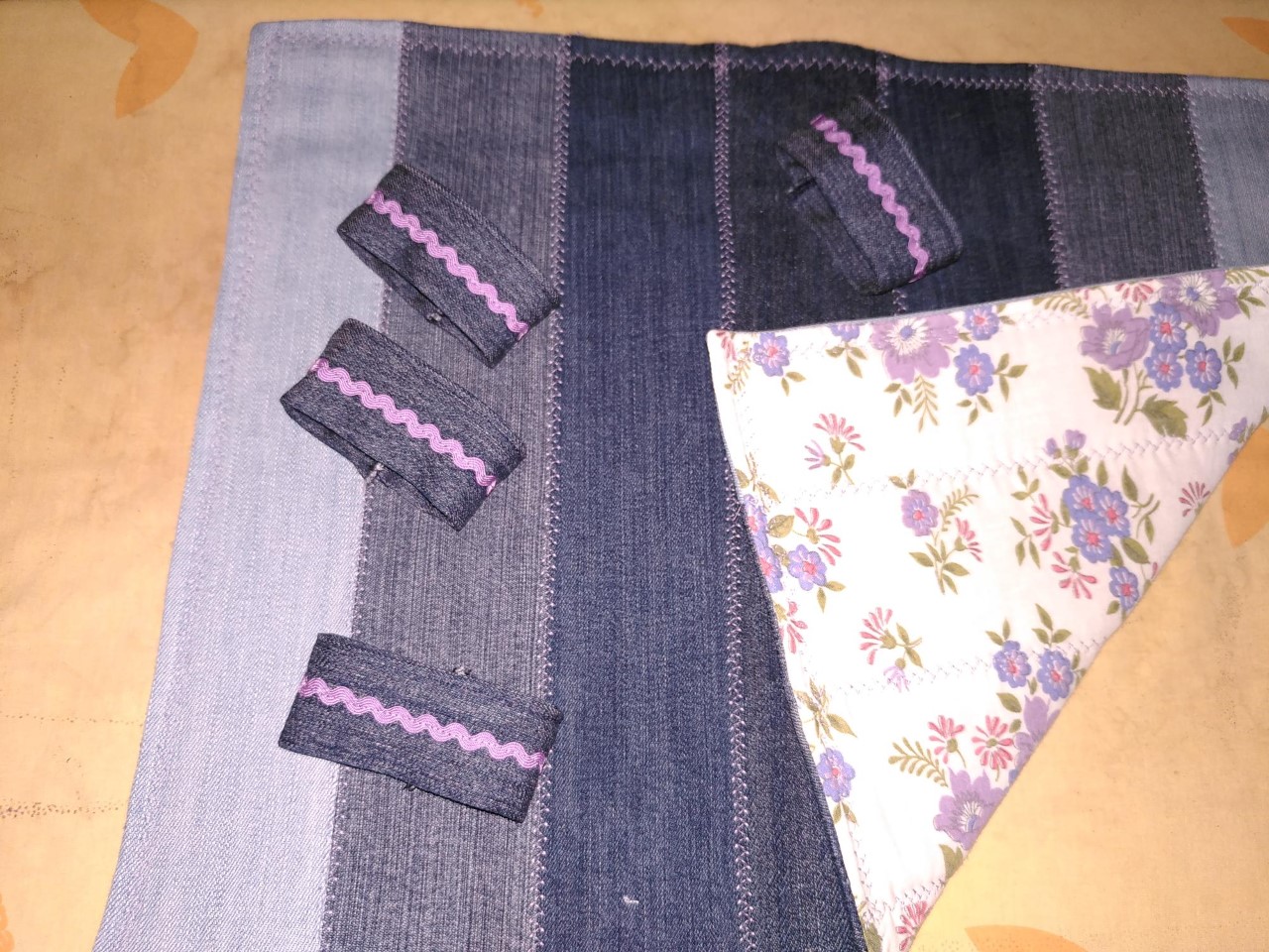 Diese Tischsets mit Serviettenringen habe ich im Juni verschenkt. Sie sind ganz einfach zu nähen und haben mir als Upcycling-Projekt richtig gut gefallen (verarbeitet wurden alte Jeans und alte Baumwoll-Bettwäsche). Gekauft habe ich nur die Vlieseline für die Tischsets und die Zackenlitze für die Serviettenringe.