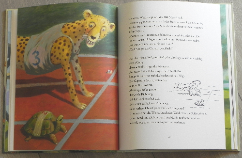 Auf für erwachsene Leser*innen ist es zum Piepen, wenn Frosch, Meise und Schmetterling sich mit mehr als unhandlichem Equipment beim Kugelstoßen abmühen, Schnecke, Schildkröte und Gepard um die Wette rennen und der Elefant das Wettschwimmen aufmischt. Und was Hamster und Pinguin sich einfallen lassen, um als schlechteste Boxer der Welt in der Geschichte einzugehen, ist einfach zu gut! ![]()
