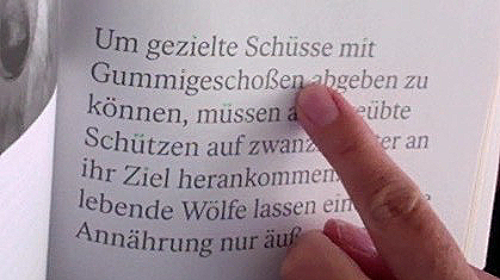 „Viele fürchten den Wolf. Doch wie gefährlich sind Wölfe wirklich? – Äußerst gefährlich! Für Rehe, Wildschweine, Schafe, Ziegen, sogar Biber und Murmeltiere. Für Menschen hingegen sind Wölfe keine besondere Bedrohung.“ (Seite 29)