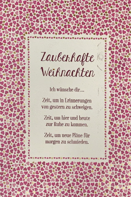 Ich habe heute die letzte Karte auf den Weg gebracht, ein Nachzügler eben. Ob ich alle Karten erhalten habe? Weiß ich nicht, ich habe nur Buch geführt über die, die ich geschrieben habe. Ich hoffe, sie kommen alle rechtzeitig an.