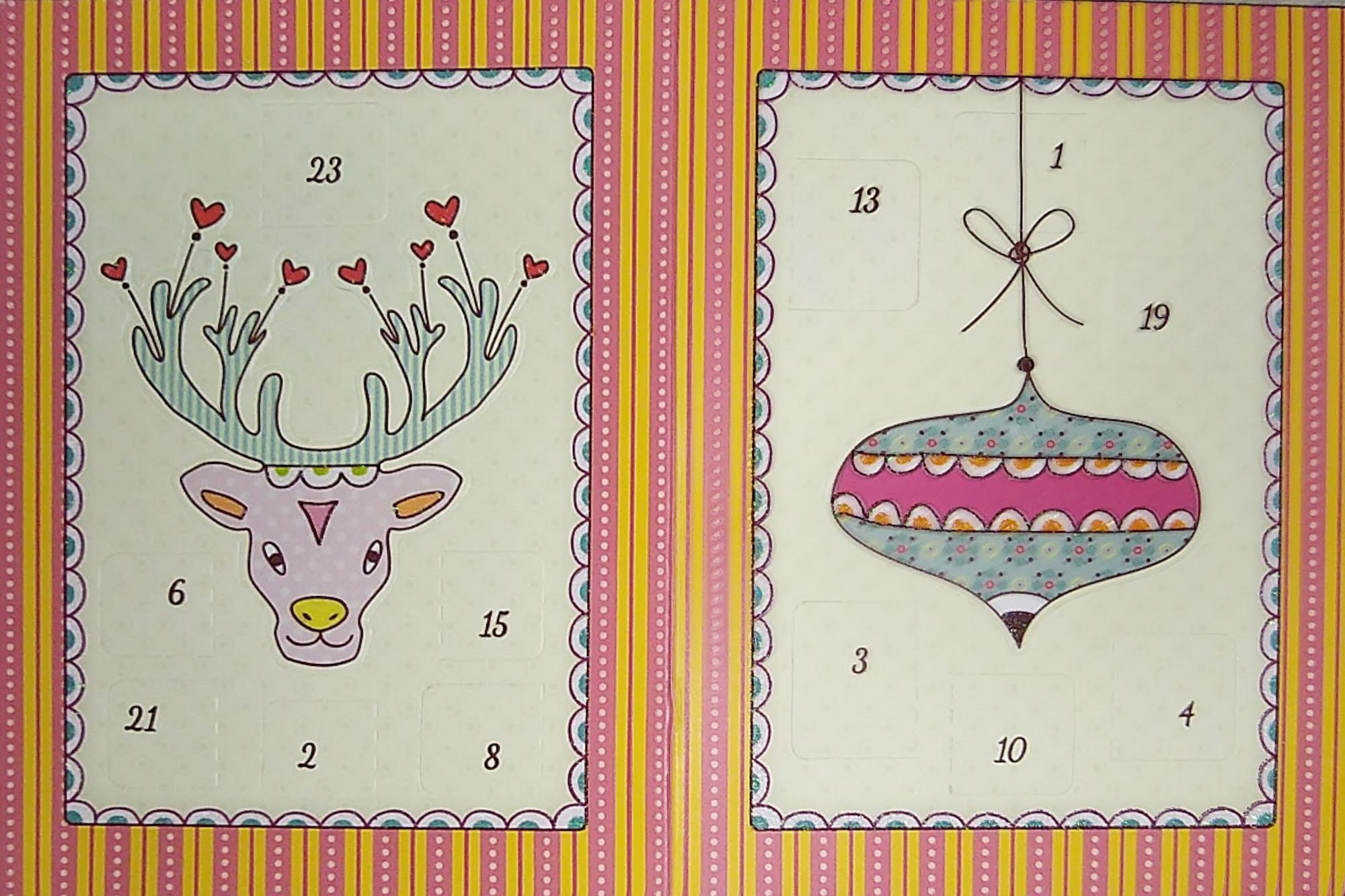 Das hier ist ein ganz toller Adventskalender von geli73 - die Rückseite sieht genauso aus, man kann das Ganze dann aufrecht hinstellen und in die Mitte eine Kerze, die dann die geöffneten Türchen von innen beleuchtet. Ich bin komplett hingerissen, vielen lieben Dank dafür!