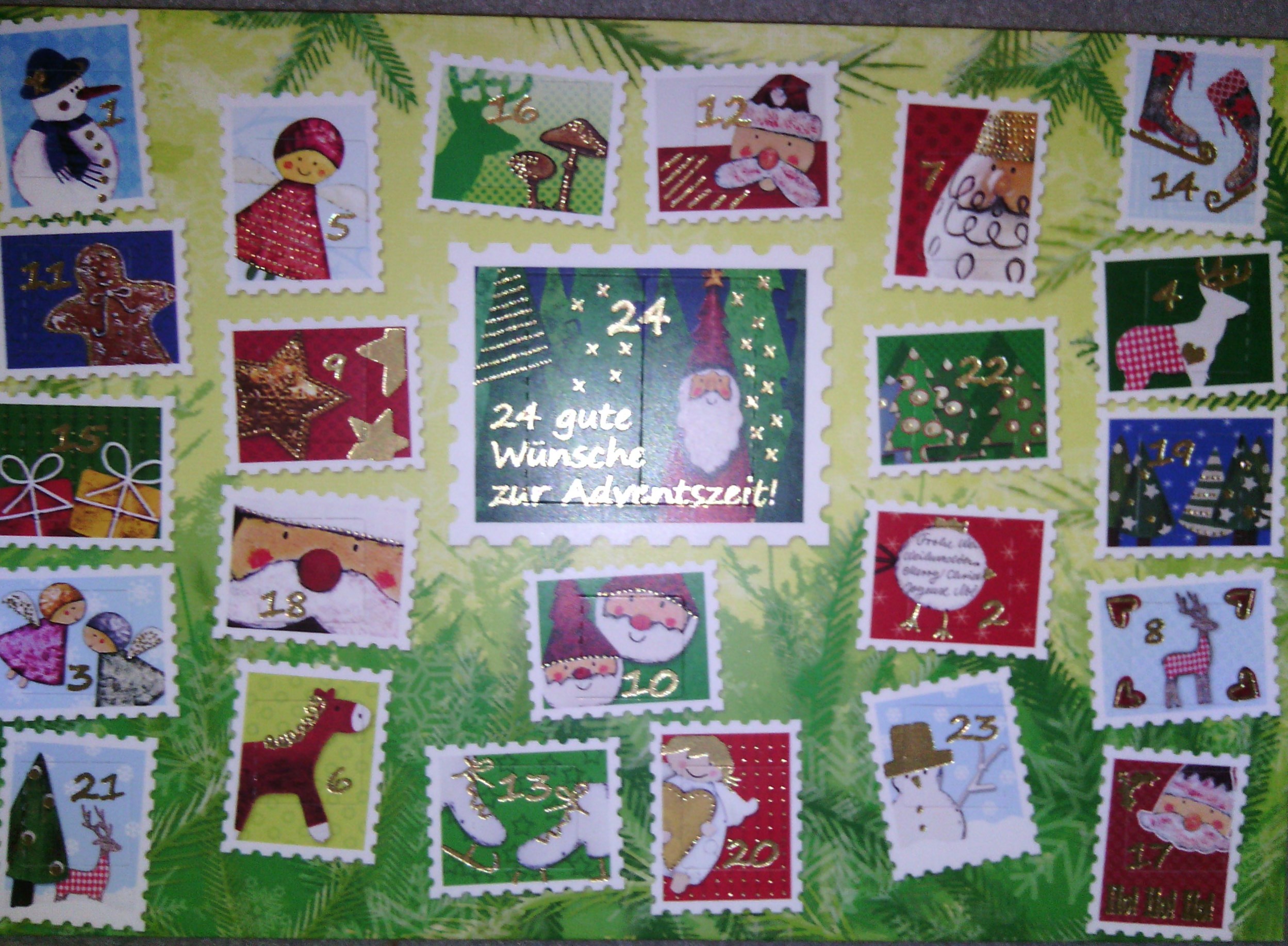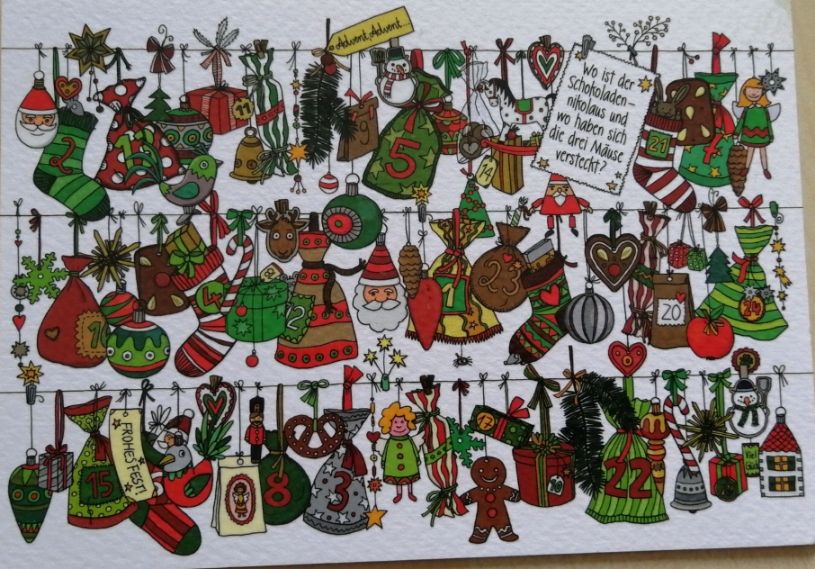 Den Adventssonntag haben wir dann doch anders verbracht, während hier die Karten schon ankommen. Da sind echt tolle Karten dabei. Gestern ist auch die erste bei mir angekommen, danke belladonna für das lustige Suchbild und deinen Willkommensgruß.