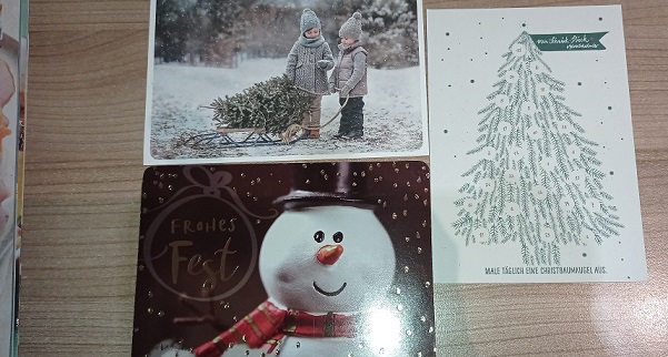 so ich habe schon mal welche geschrieben, jetzt schick ich meinen Mann zur Post brauch Briefmarken. Ich hab allerdings nur ganz normale Weihnachtskarten bekommen.