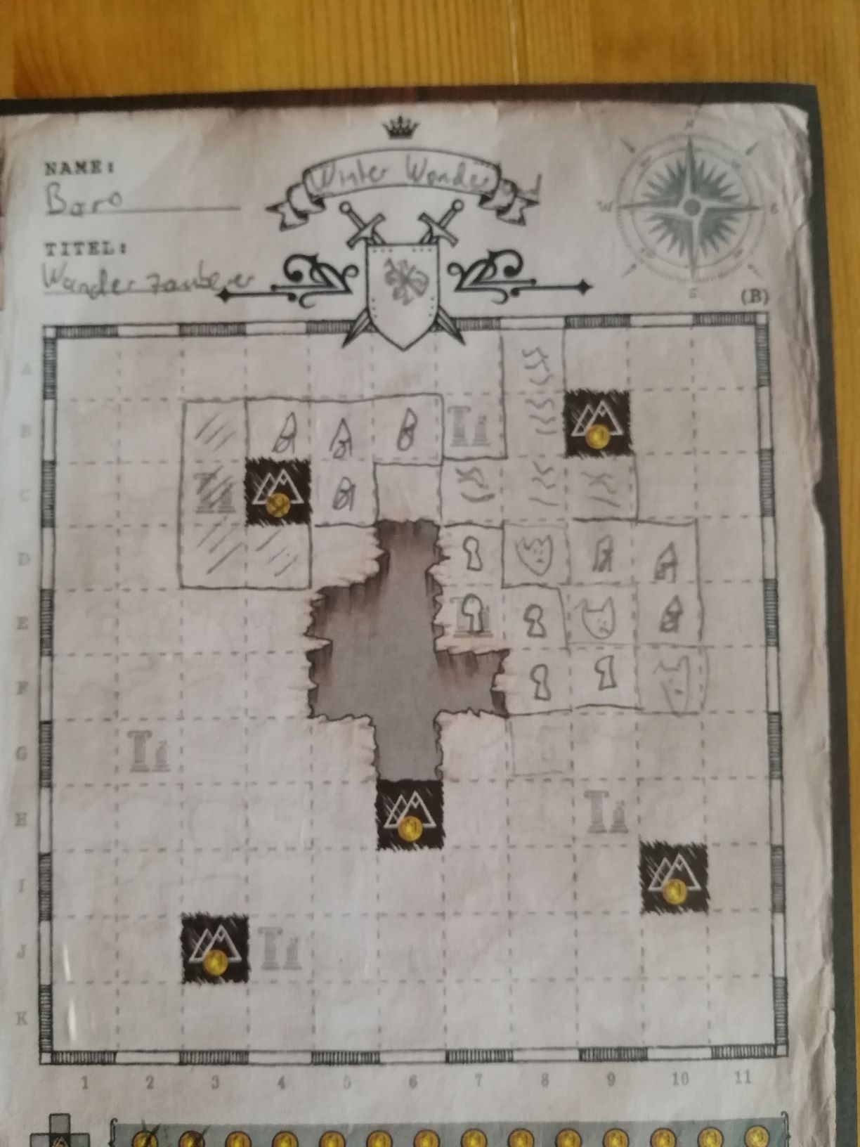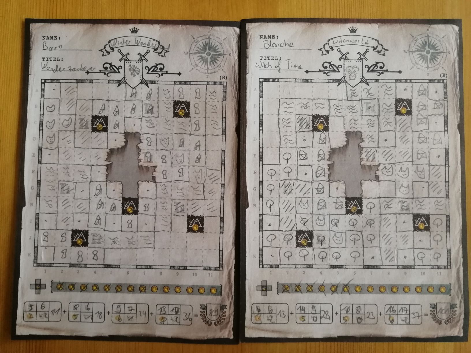Wir sind Kartographen und sollen die nördlichen Landstriche entdecken und kartieren. Welchen Namen haben die Landstriche? Hier fangen die schönen Details bereits an, jeder Spieler gibt sich selbst einen Namen, einen Titel, sowie kann das Land, was entdeckt werden soll benennen und sogar ein Wappen kann gemalt werden, für all das ist Platz auf dem Spielzettel. Wir müssen die verschiedenen Landschaftstypen ausmessen und auf unserer Karte, dem Spielblock, eintragen. Hierbei hat natürlich jeder seine eigene Karte. Vorgegeben werden Landschaftstyp und -größe durch die Spielkarten, die dem Spieler immer 2 Wahlmöglichkeiten geben: Entweder eine festgeschriebene Form und die Wahl zwischen zwei Landschaftstypen, oder 2 unterschiedliche Formen, dafür ist die Landschaft nicht wählbar. Auf jeder Karte ist noch angegeben, wie viel "Zeit" zur Erkundung vergeht, 1 oder 2 Einheiten. Frühling und Sommer enden nach 8 Einheiten, Herbst nach 7 und Winter nach 6 Einheiten. Nach jeder Jahreszeit wird der Kartenstapel wieder gemischt, so dass wieder alle Karten zu Verfügung stehen.