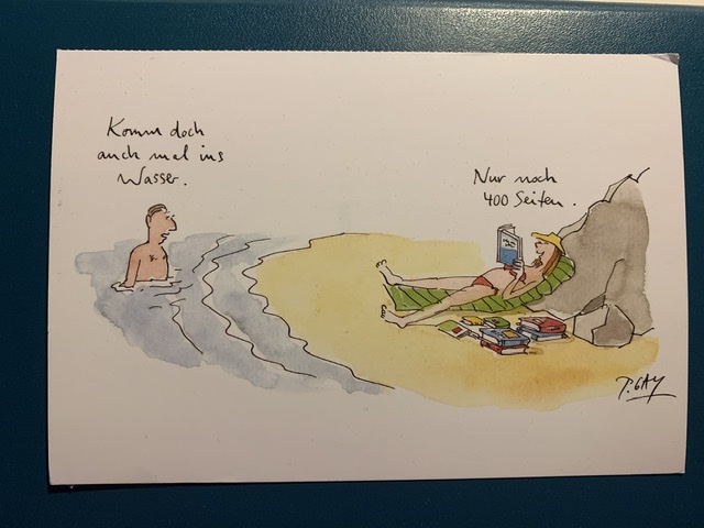 Von Rouge stammt die Karte mit den beiden Damen von Inge Löök - ich mag ihre Motive total. So wie abgebildet geht es mir beim Ausmisten auch oft - ich muss zwischendrin anfangen zu lesen.