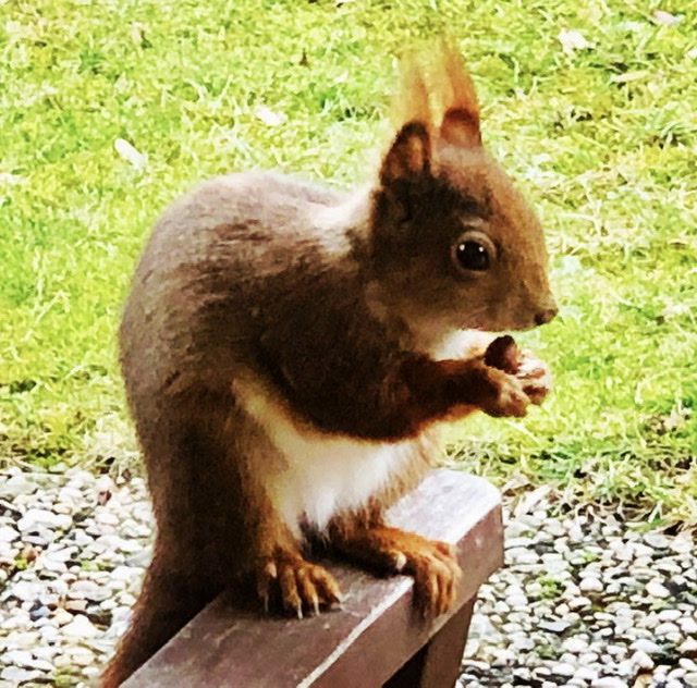 "Unser" Eichhörnchen kommt recht nah, um sich Nüsse zu holen, auch wenn wir draußen sind, hält aber doch einen Sicherheitsabstand.