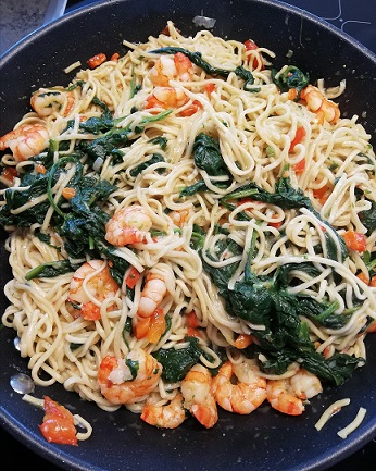 Heute gab es die Asianudeln mit Garnelen. Ich habe aber geschummelt: es war schon so spät und ich habe abgekürzt und die Shrimps parallel zu dem Ganzen in einer 2. Pfanne angebraten. Hätte ich es aber in einer Pfanne gemacht, hätte ich vermutlich erst die Shrimps angebraten und dann den Rest dazugegeben.