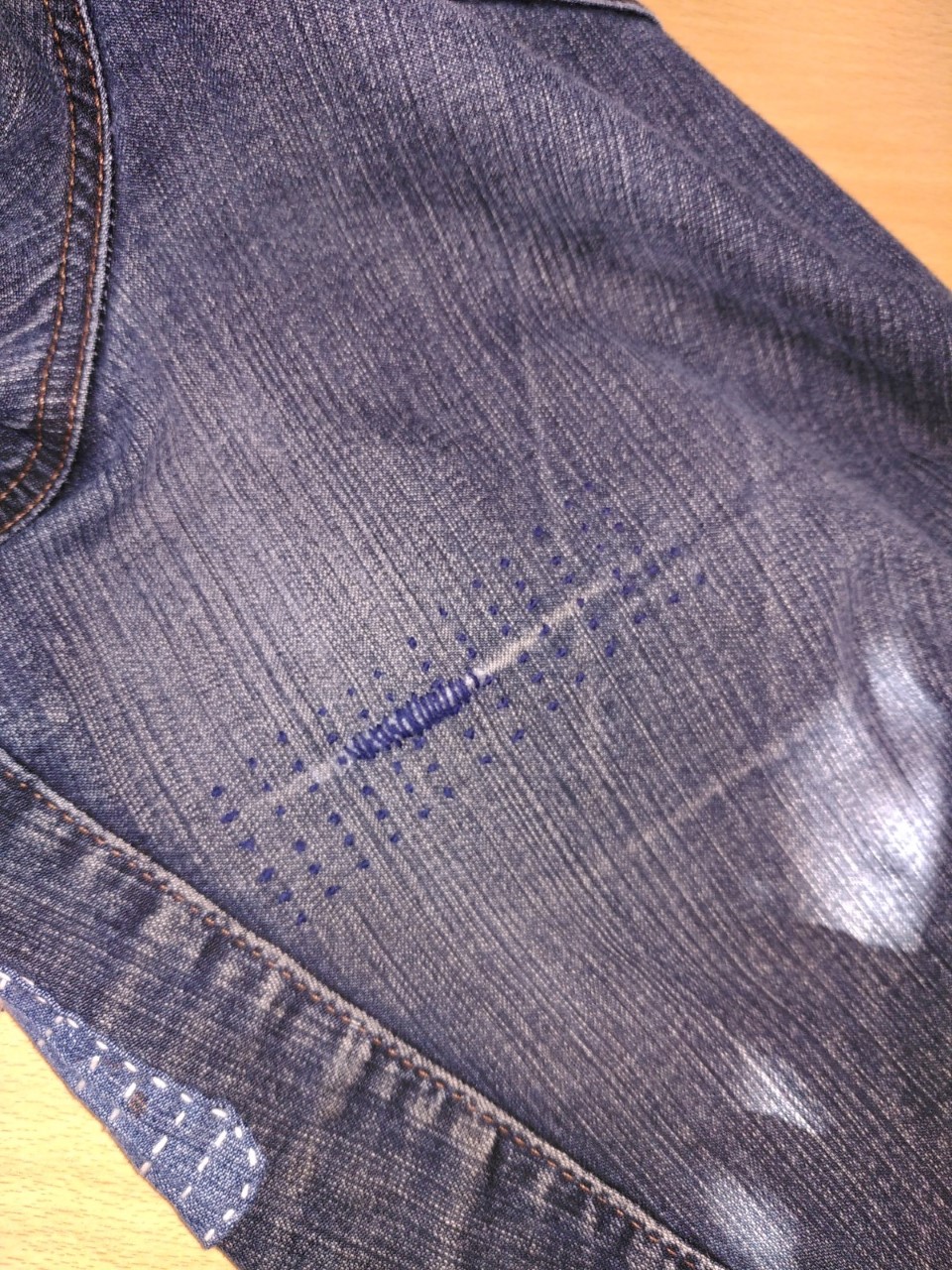 Ausprobiert habe ich Projekt 3 („Übergroßer Knieflicken“, der bei mir allerdings auf dem vorderen Oberschenkel plaziert wurde) und Projekt 12 („Weniger sichtbarer Sashiko am Oberschenkel“, womit unter anderem der Schritt gemeint ist).
