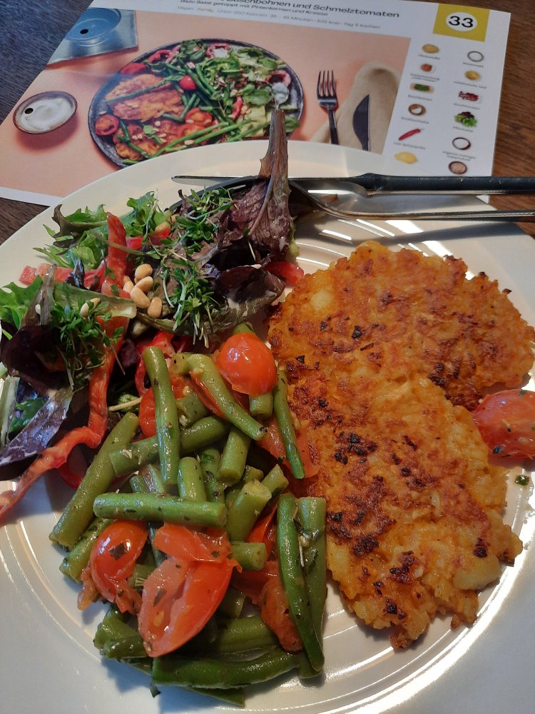 Das habe ich auch schon vorgeschlagen. Beim Salat kann man ja eh nehmen, was man will. Ich kann mir die Reibekuchen aber auch gut mit Mais oder Zucchini vorstellen.