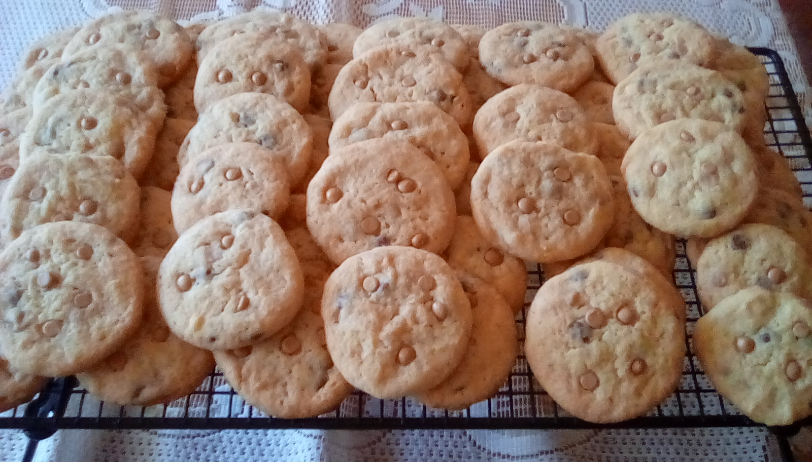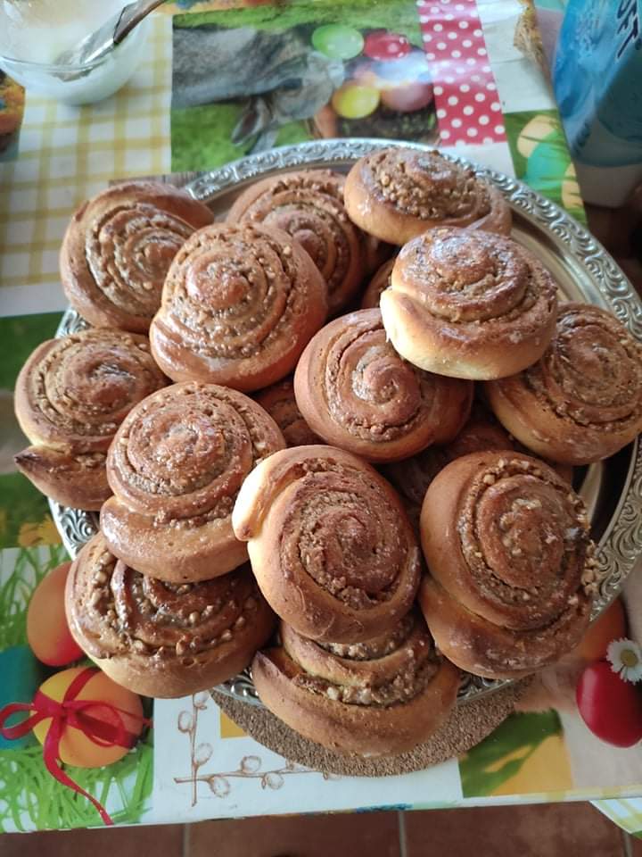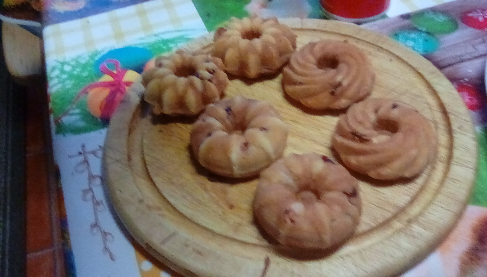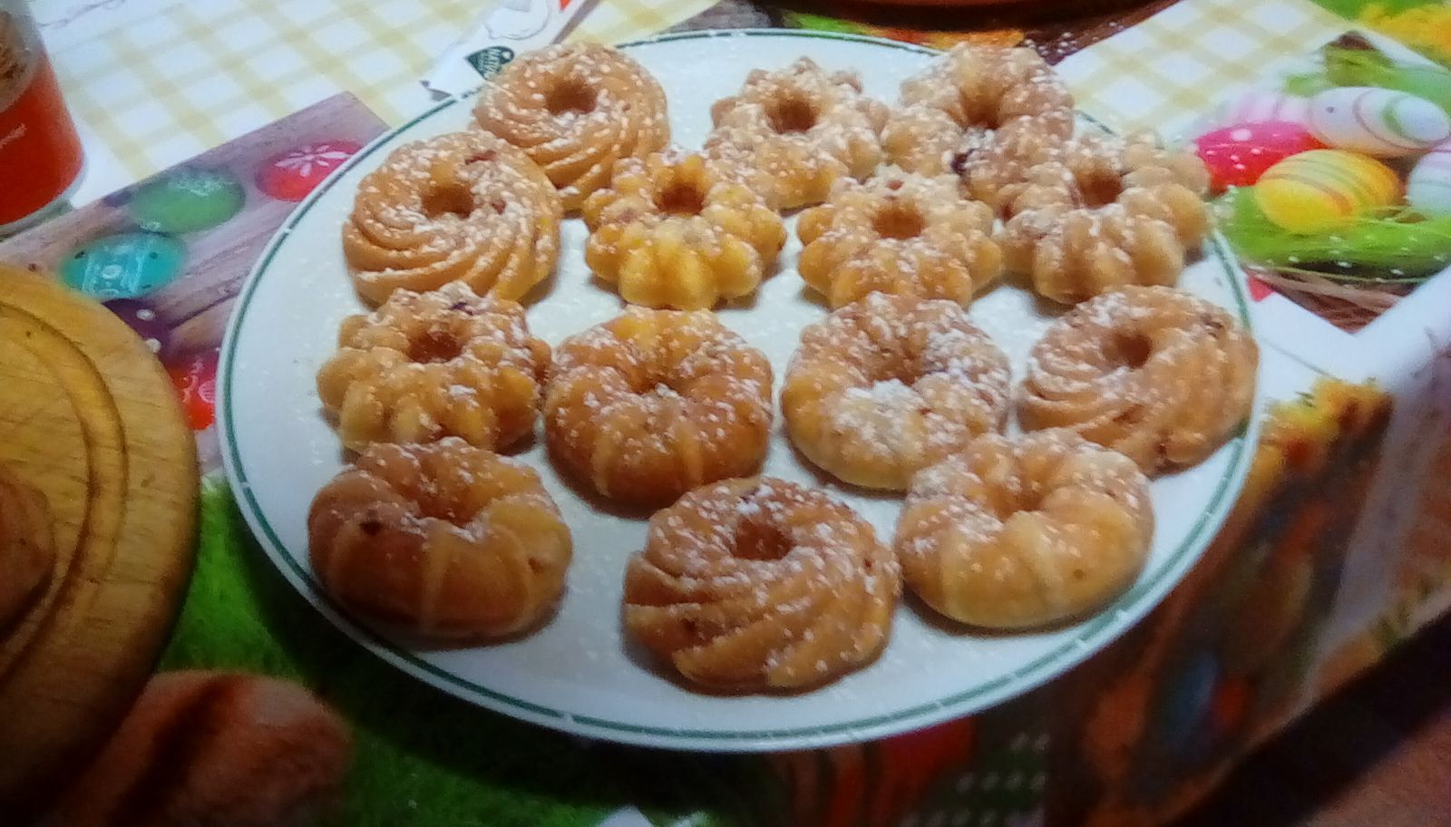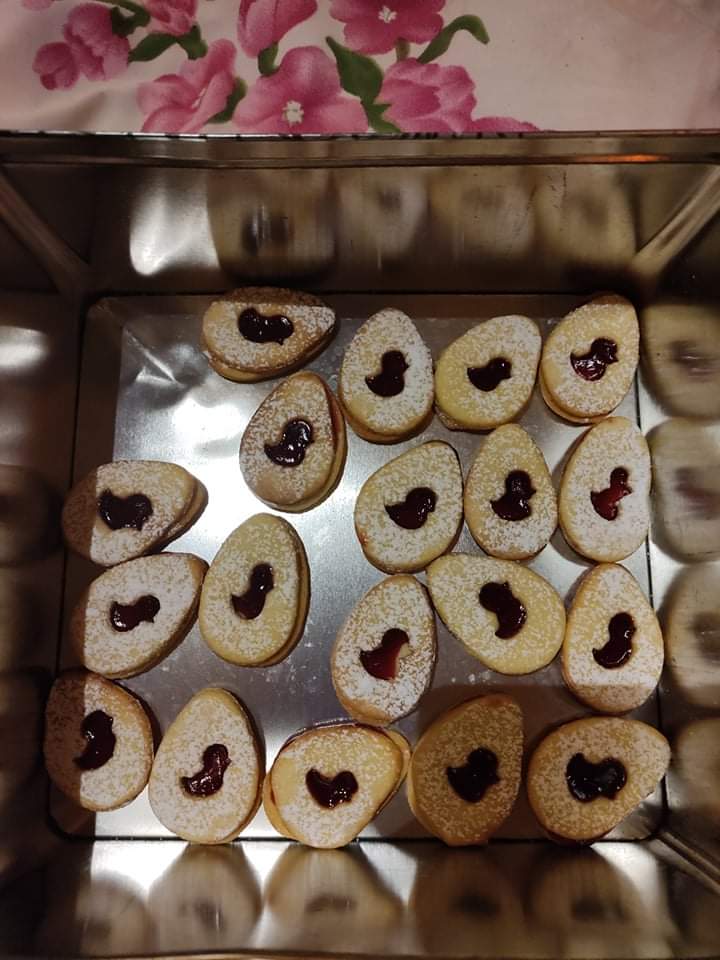 Nussschnecken, bunte Plätzchen und mit Marmelade gefüllte Plätzchen dann Schoko und Zitronen Gugelhupfs in verschiedenen Größen und eine Toffifee Torte, die steht im Kühlschrank und muss Morgen früh noch verziert werden.