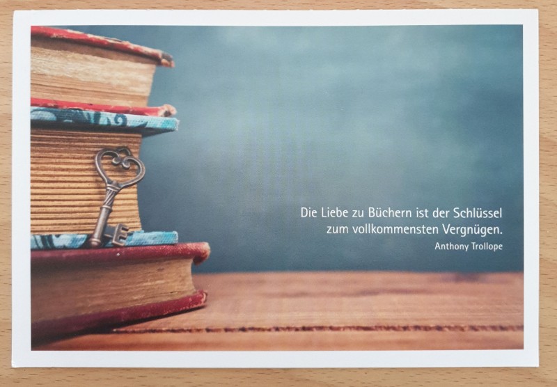 Diese tolle Buchkarte hat Schubi mir geschickt. Ich bin noch mittendrin im Urlaub. Wir hatten viel geplant, können uns beide aber nicht so richtig aufraffen. Vielleicht ist die Ruhe einfach nötig. Morgen geht es ins Kino.