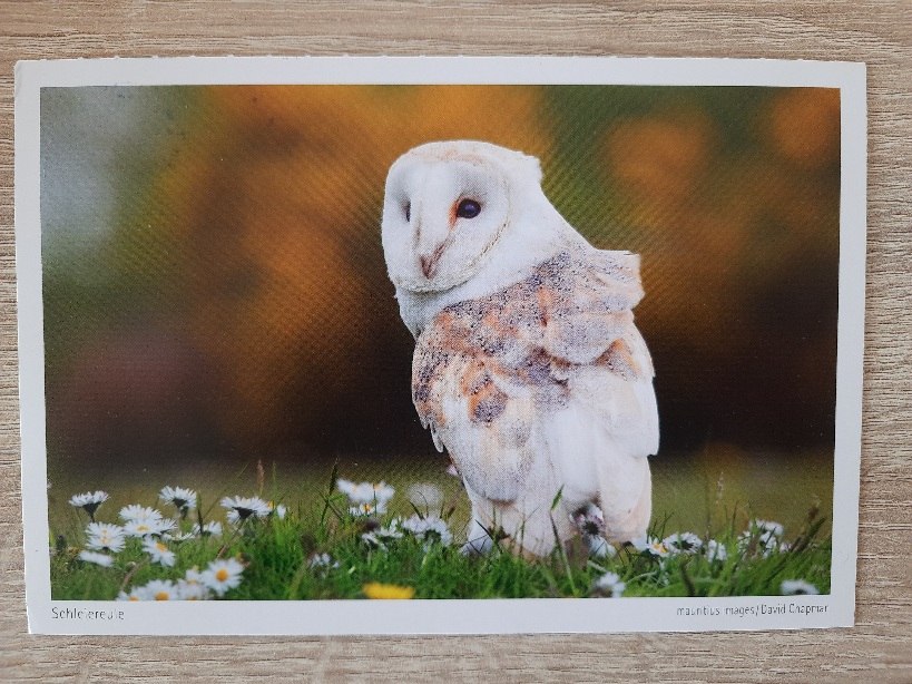 Danke für Deine Karte mit der Eule, ich musste sie zehn Mal herumdrehen, bis ich herausgefunden habe, wie ich die Eule richtig sehen kann. Eine West-Kreischeule, tz, passt gar nicht zu mir, wo ich doch so ein ruhiger Typ bin.