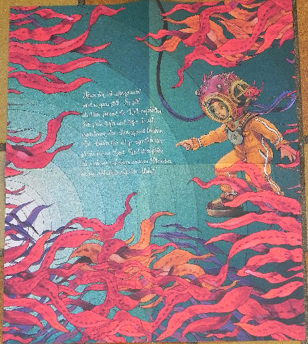 Ich glaub’, wesentlich jünger als in der Altersempfehlung angegeben sollten die Kinder nicht sein, denen man das Buch in die Hand gibt bzw. ihnen daraus vorliest. Sonst besteht die Gefahr, dass sie’s nicht verstehen. Der Bankrott des Vaters, die Seele des Meeres, der skrupellose Geschäftsmann, der auf die harte Tour lernen muss, Prioritäten zu setzen, das setzt schon ein bisschen Wissen über die Welt voraus.
