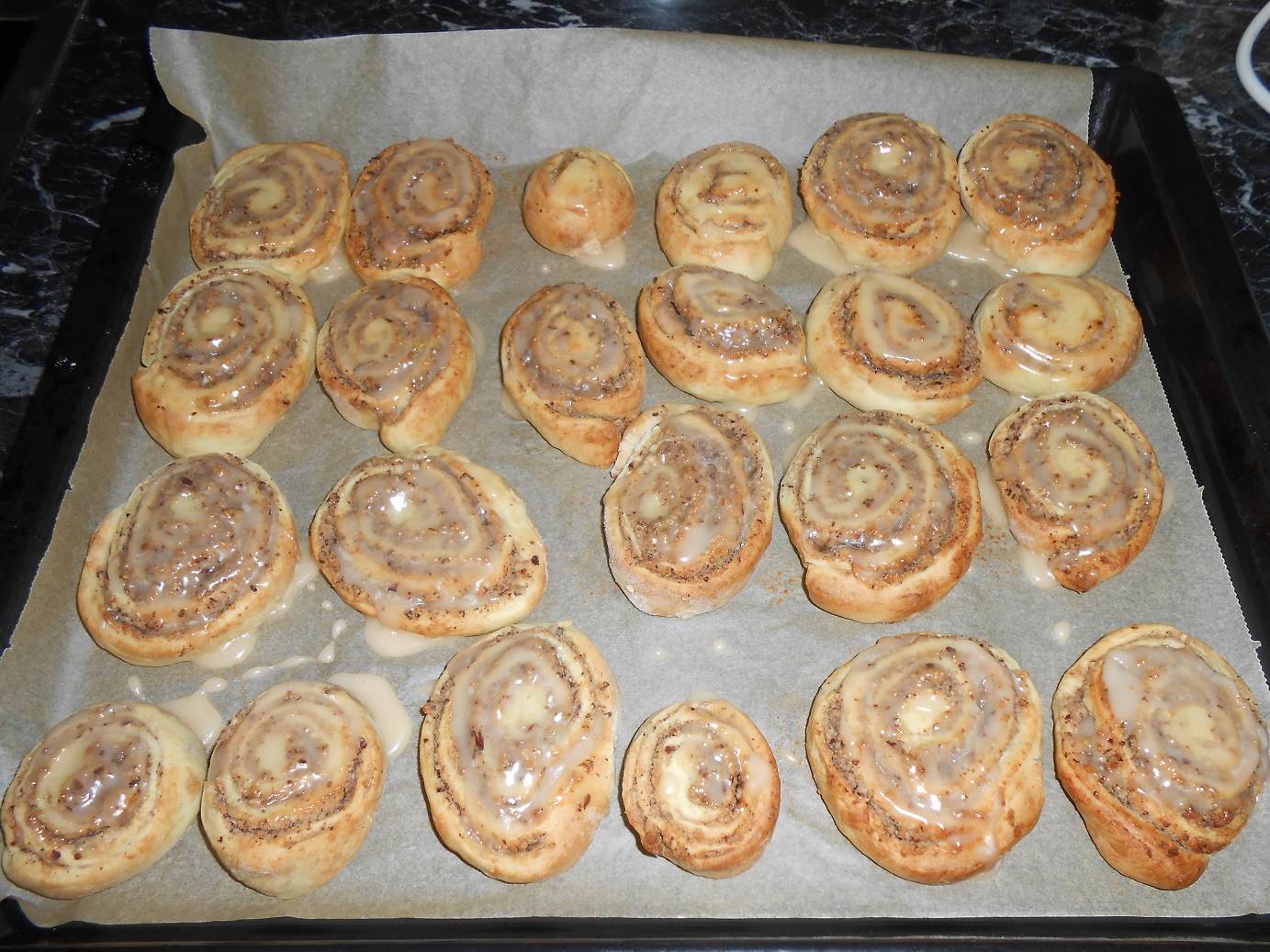 sind 2 Bleche beim 2. habe ich nicht alle mit Glasur bestrichen ( Puderzucker/Mandarinensaft, vorhin frisch gepresst, da sie weg mussten, den Rest Saft habe ich dann getrunken)