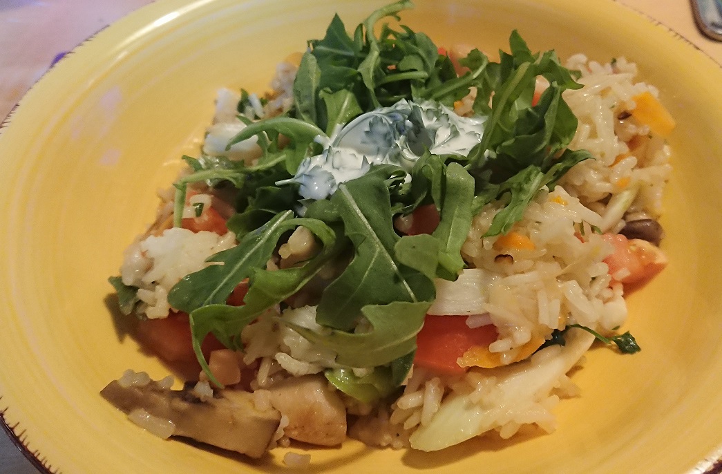 Hier gab es heute was von Hello Fresh, das aber durchaus punktetauglich war: Reis mit Kräuterseitlingen und Tomate, dazu ein Schmanddip und Rucola. Interessante, aber leckere Kombi.