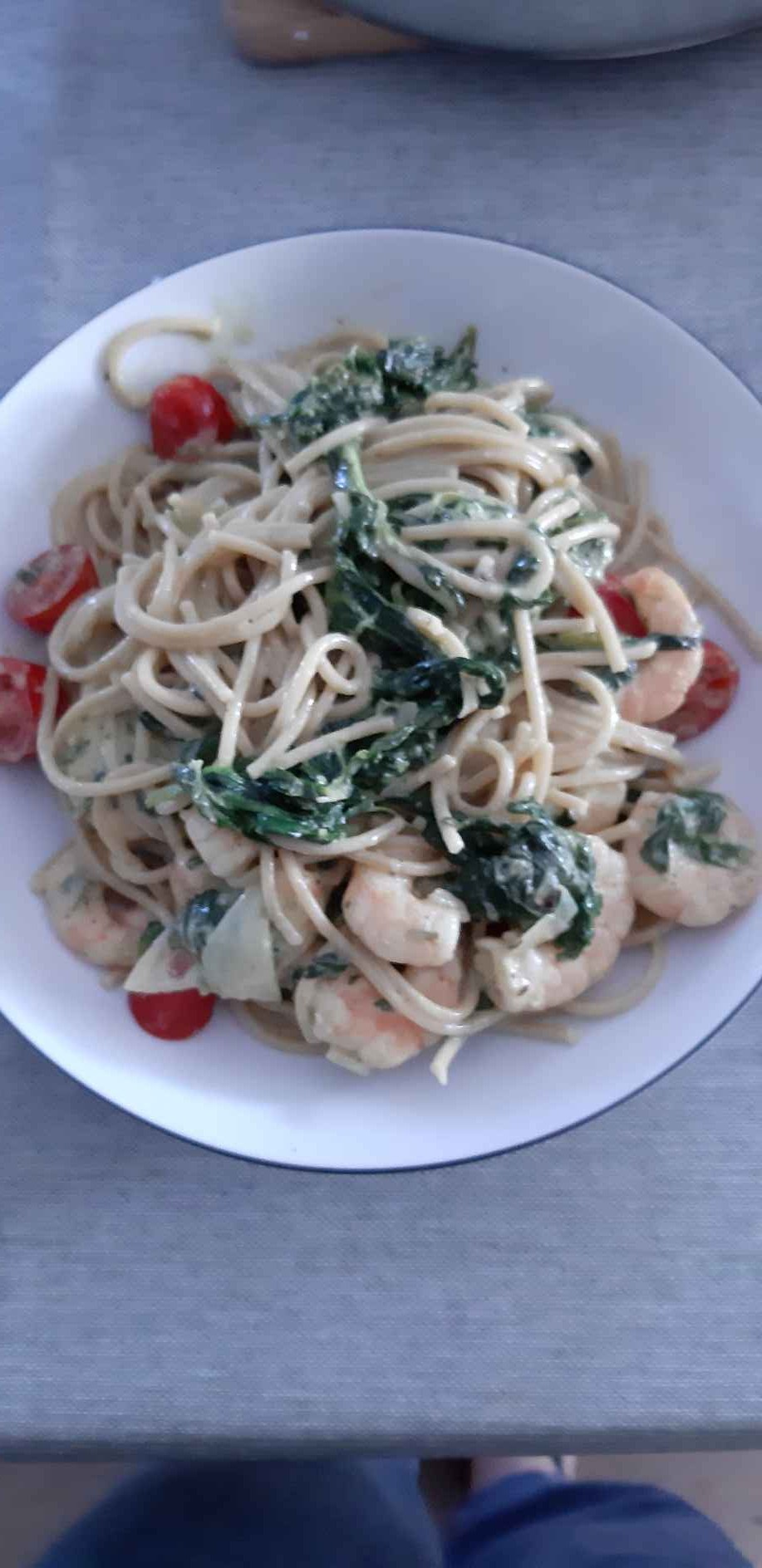 Zwiebeln in etwas Öl anbraten, Garnelen dazu geben und mit Zitronensaft ablöschen, Salzen und pfeffern. Garnelen aus der Pfanne nehmen und dafür den Spinat dazugeben (Ich hatte TK-Spinat), wenn der Spinat aufgetaut ist (war bei mir noch nicht ganz), die Flasche Hollandaise dazu geben und mit Wasser die Flasche ausspülen und dazu geben. Alles Köcheln lassen und mit Salz und Pfeffer und anderen Gewürzen abschmecken. Zum Schluss die Tomaten dazugeben und etwas erwärmen und die Nudeln untermischen.