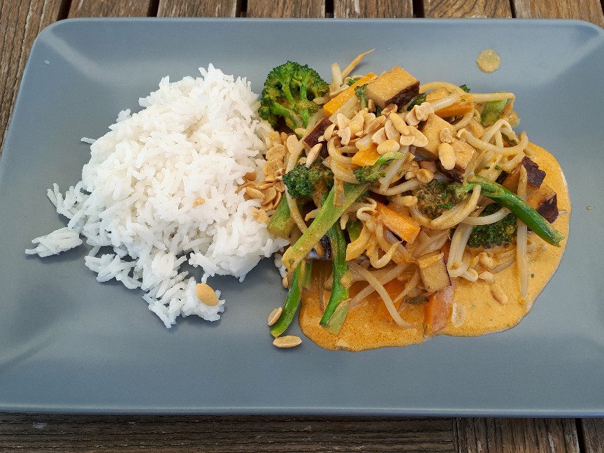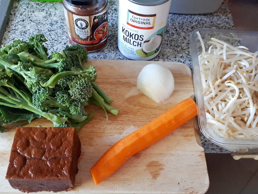 Der Urlaub ist vorbei. Wieder zu Hause wird die Selbst-Koch-Quote erhöht und es gab Gemüse (wilder Brokkoli, Karotte, Zwiebel, Sprossen) und Räuchertofu in Currysauce mit Reis und ein paar Sojakernen