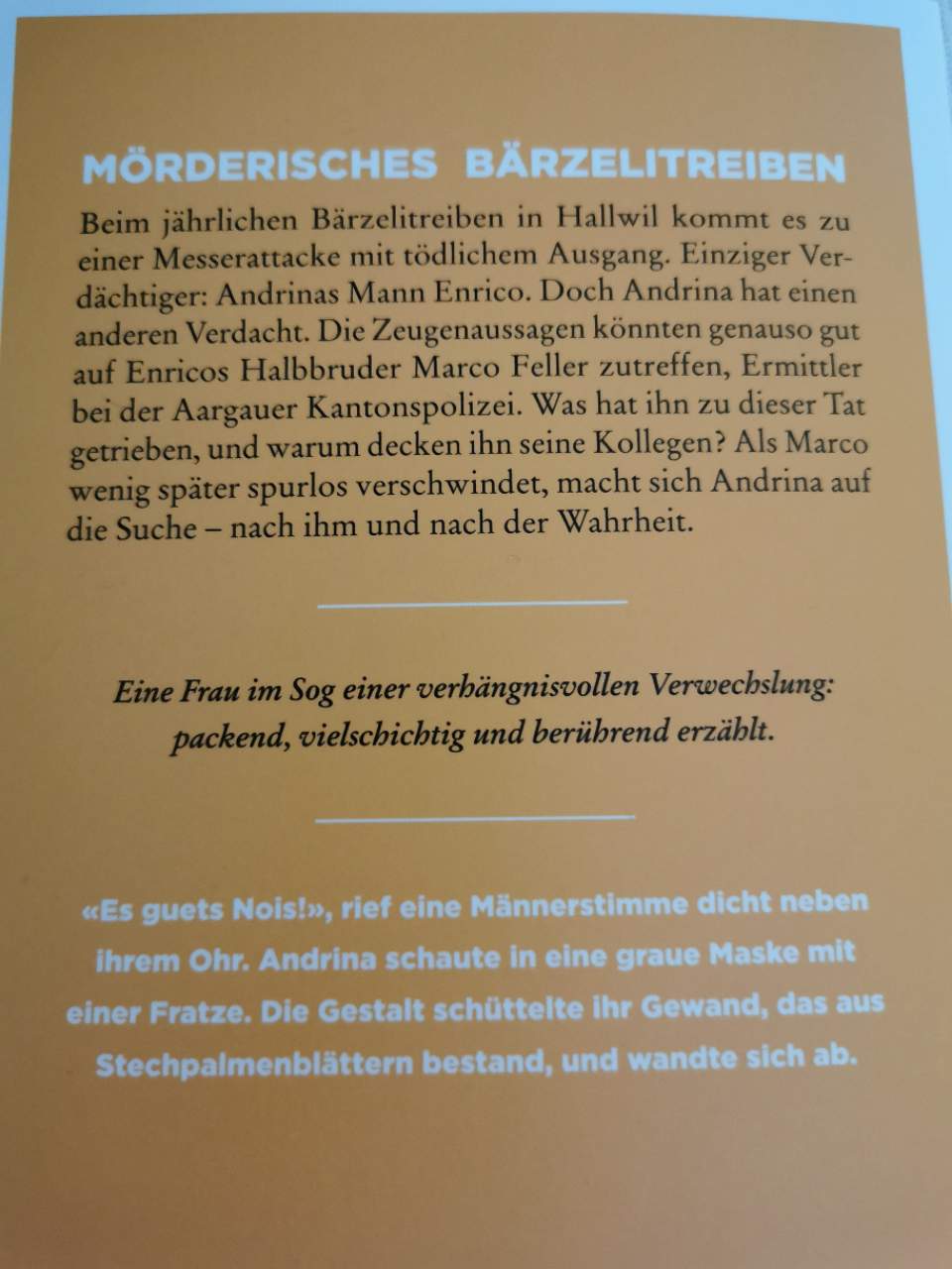Beim jährlichen Bärzelitreiben in Hallwil kommt es zu einer Messerattacke mit tödlichem Ausgang. Einziger Verdächtiger: Andrinas Mann Enrico. Doch Andrina hat einen anderen Verdacht. Die Zeugenaussagen könnten genauso gut auf Enricos Halbbruder Marco Feller zutreffen, Ermittler bei der Aargauer Kantonspolizei. Was hat ihn zu dieser Tat getrieben, und warum decken ihn seine Kollegen? Als Marco wenig später spurlos verschwindet, macht sich Andrina auf die Suche – nach ihm und nach der Wahrheit.