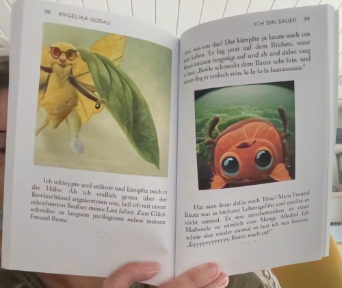 Es ist ja süß von Sauer, dass er der Hummel so beharrlich zu helfen versucht. So unverschämt, wie sie darauf reagiert, hätte ich sie plärren lassen! Wie gut es war, dass Sauer nicht aufgegeben hat, zeigt sich wenig später bei seiner Begegnung mit einer Spinne. Und als Maikäfer Bautz in einem Bowlegefäß zu ertrinken droht, muss Sauer sich ganz schnell was einfallen lassen.