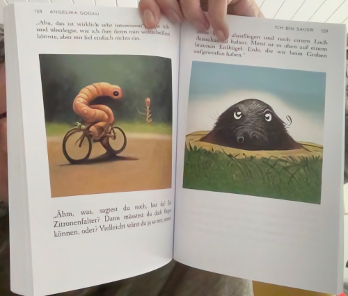 Die Illustrationen sind fantasievoll und farbenfroh. Manche wären mir als Kind zu surreal und rätselhaft gewesen. Das hätte mich beschäftigt: Haben die Raupen auf Seite 6 nur ein Auge? Was ist das für ein Viech im Superman-Kostüm auf Seite 88? Sauer? Warum hat er dann keine Flügel und ist orange? – Den Regenwurm auf dem Fahrrad auf Seite 128 finde ich regelrecht verstörend – eine Albtraum-Kreatur! So toll die kreativen Illustrationen für Erwachsene aussehen: Kriegen die Kids davon keine schlimmen Träume? Aber wahrscheinlich ist die medienerfahrene Jugend von heute deutlich härter im Nehmen als wir damals.