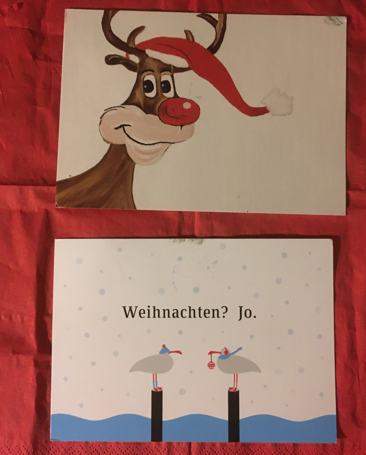 Ich halte mich ja dieses Jahr in Sinne der Entschleunigung extrem zurück mit Weihnachtskarten und hab erst ganz wenige geschrieben.