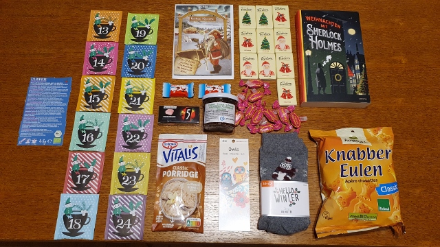 Tee, zwei wunderschöne Tassen, sehr schönen Baumschmuck aus Holz und außerdem ein Literatur-Rätselbuch. Das klingt sehr spannend und das muss ich mir noch näher ansehen.