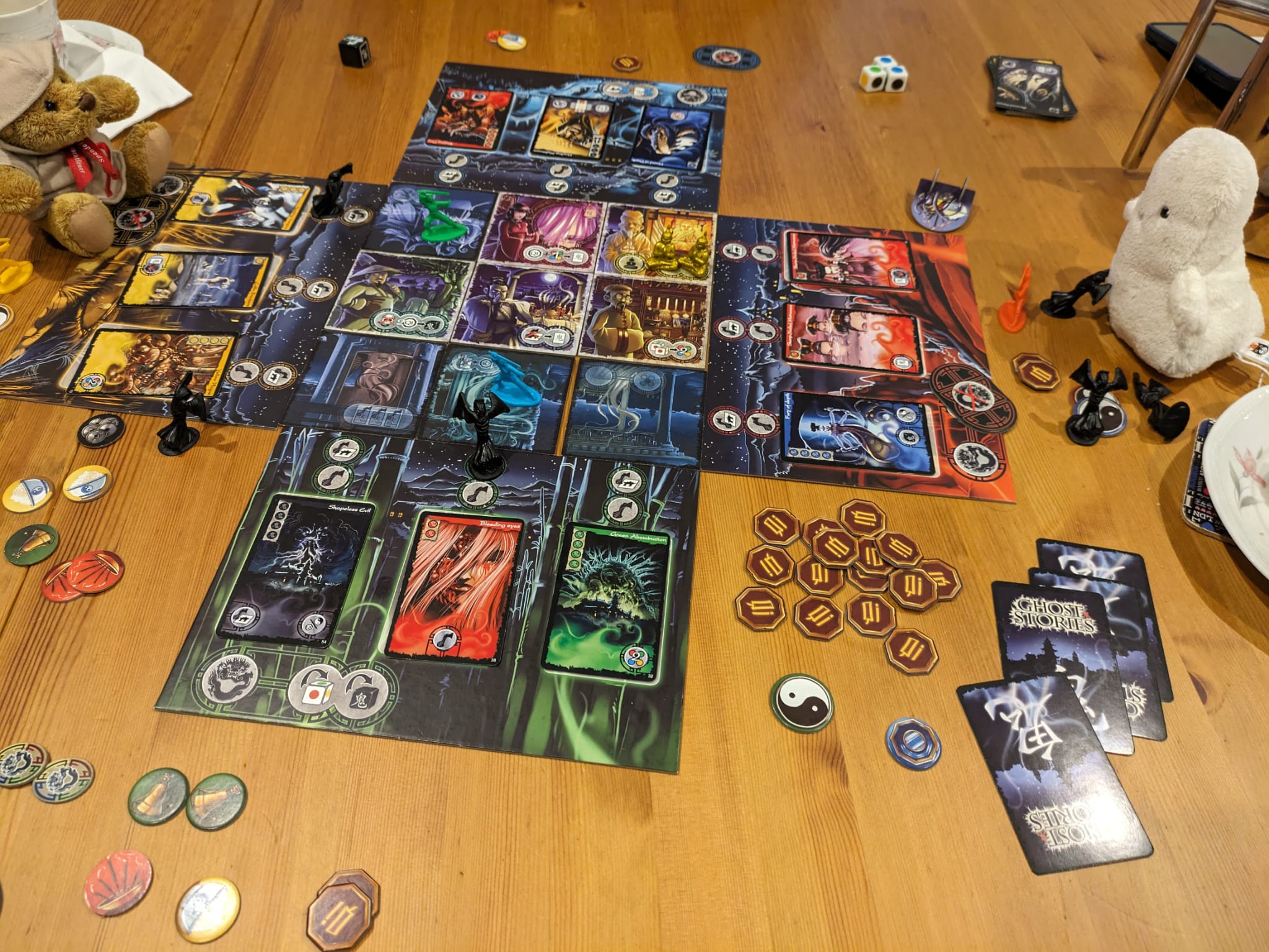 Und dann konnten wir ja die Niederlage in Ghost Stories gestern nicht auf uns sitzen lassen und haben es mit Plüschtierunterstützung für die passiven Charakter nochmal probiert. Es war ein harter Kampf, aber gegen Ende haben die bösen Geister unser Dorf überrannt und es hat in vier Häusern gespukt. Nächstes Jahr gibt es dann die nächste Chance.