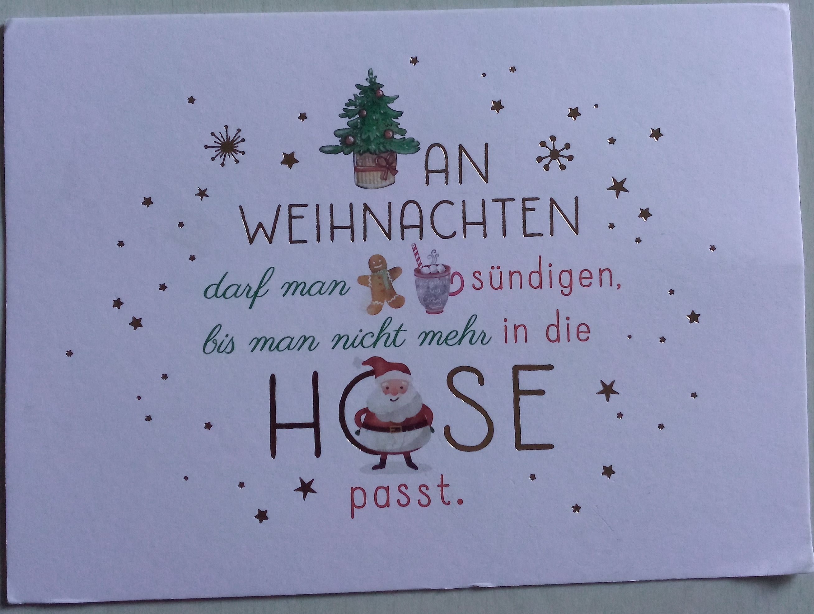 Aber privat muss / will ich nun am Wochenende endlich unsere Weihnachtspost schreiben, da habe ich noch nicht eine Karte geschrieben... und ich finde Weihnachtspost halt viel netter als die "quietschigen WA Filme" die man so bekommt - meistens habe ich dann eh das Handy aus von vor Weihnachten bis ins neue Jahr.. bzw. schaue nicht in WA rein.