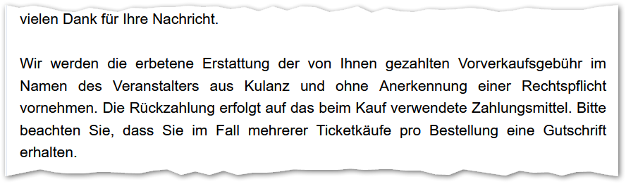 Also schrieb ich noch eine Mail, bedankte mich für die Automatenantwort und verwies auf ein Grundsatzurteil des LG München, nach dem eine Einbehaltung von Gebühren bei Absage unzulässig wäre. Ich setzte eine Frist und kündigte an, im Zweifelsfall eine gerichtliche Entscheidung herbeiführen zu lassen (was bei diesem Betrag allerdings schwierig wäre). Außerdem merkte ich an, dass doch wohl nicht die Käufer das Risiko einer Absage zu tragen hätten, sondern Künstler und Veranstalter (die mit Sicherheit auch dagegen versichert sind). Und, siehe da, zehn Minuten später kam dann diese Mail: