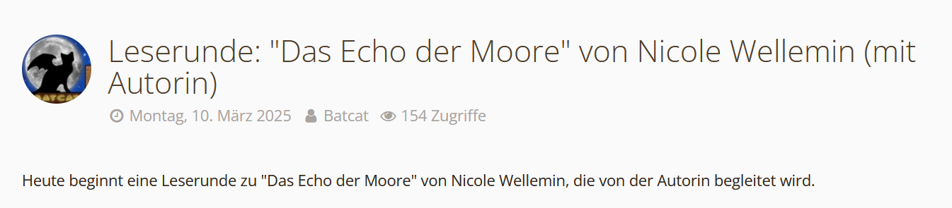 im Februar erscheint das neue Buch von Nicole Wellemin Das Echo der Moore . Das klingt so gut und die erste Leserunde war so schön, dass ich gleich eine neue Runde planen musste und mich sehr freue, dass Nicole auch wieder dabei ist.