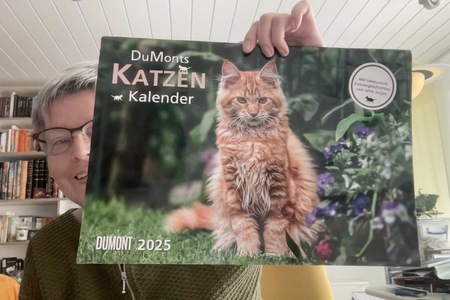 DUMONTS Katzenkalender 2025: Wandkalender, 12 Kalenderblätter, Köln 2024, DUMONT Kalenderverlag, EAN: 4250809652412, ASIN: BB0CQCSM42F, 12 Katzenfotos, 12 Geschichten bzw. Gedichte von Jette Jorjan, gezeichnete farbige Vignetten, Jahresübersicht und Schulferientabelle, geheftet, Format: 42 cm x 29 cm (offen 42 cm x 58 cm), EUR 18,00.
