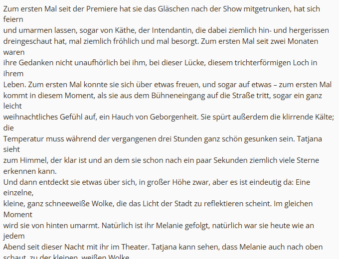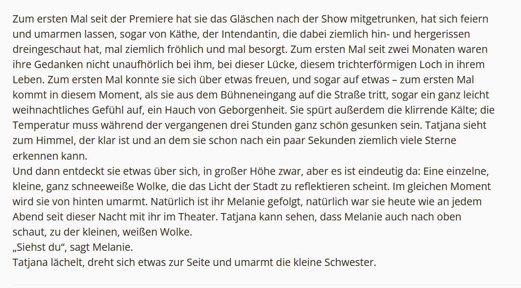 Falls es jemanden interessiert, es gibt quasi eine Geschichte zur Geschichte. Ich stehe seit ungefähr September in lockerem Mailkontakt mit einer Frau, die im Sommer mit ihrem Mann im Urlaub war. Sie haben in der Urlaubszeit im Wechsel "Freitags bei Paolo" und "Die Wahrheit über Metting" gelesen, eher zufällig, weil sie vorher noch nie von mir gehört hatten. Und sie fanden die beiden Bücher ganz großartig, haben darüber viel geredet und so. Und dann hatte er - er hieß auch noch Tom - nach dem Urlaub einen Motorradunfall und war plötzlich weg.