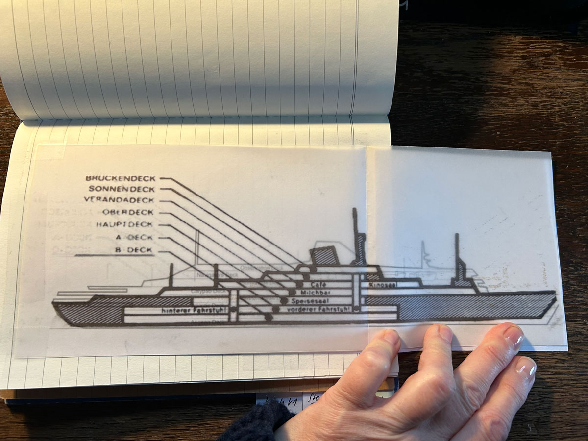 Zum Ende des Abschnitts vermute ich: Elli ist die Tochter von Karin. Sie sucht die Familie ihrer Mutter. Karin ist vielleicht der Liebe wegen aus der DDR geflohen in den Westen, hat Elli bekommen... wegen der Flucht hat ihr Bruder sein Seefahrtsbuch verloren. Vielleicht war es sogar so, dass Elli auf einer Reise mit der Völkerfreundschaft geflohen ist.
