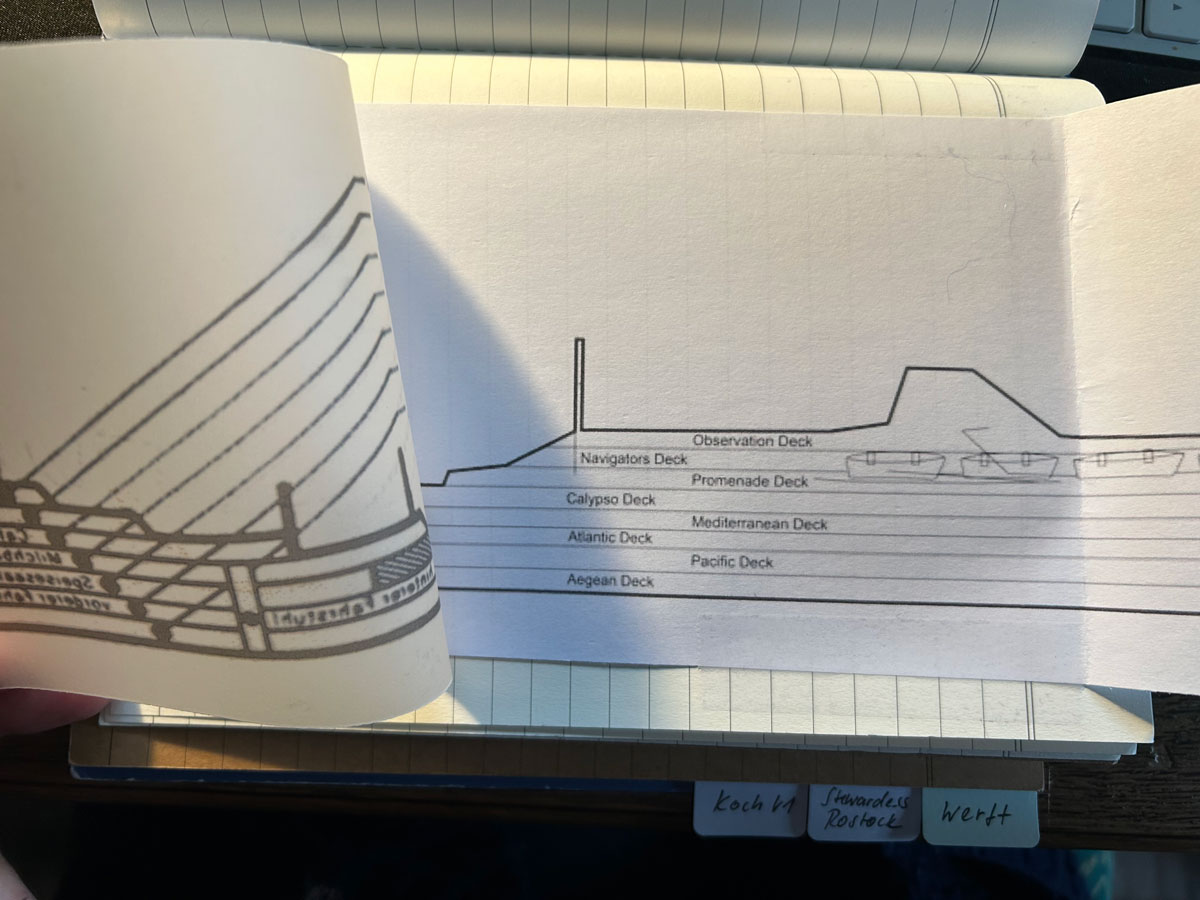Um die Gegenwartsebene mit der Vergangenheit verbinden zu können, habe ich die Deckspläne von Stockholm und Astoria miteinander verglichen und die Querschnitte auf Pergament ausgedruckt und übereinander gelegt, damit ich immer gleich sehen konnte, welche Ebene wann wie heißt.