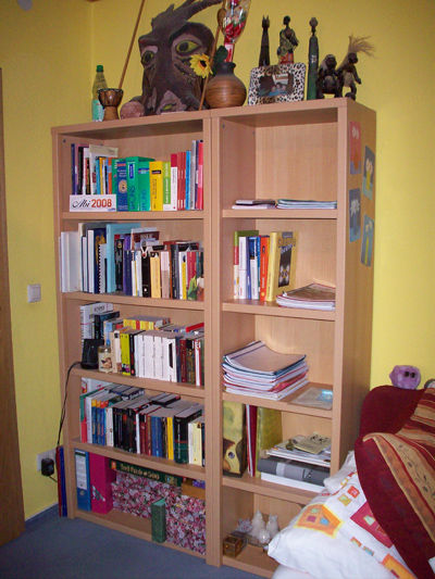 In dieser Ecke befinden sich drei Regale. Sie sind mittlerweile alle schon ziemlich voll, gar nicht mehr wie hier auf diesem Bild.