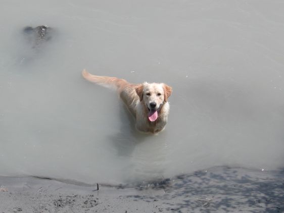 Gebadet wird im Rhein, etwa zwei bis drei Kilometer vor der Mündung in den Bodensee. das Wasser hat eigentlich (wenn nicht Hochwasser ist...) Trinkwasserqualität. Das Trübe ist ein ganz feiner Sand, den es von den Alpen runterspült. Und der im Mündungsbereich in den Bodensee immer wieder für Verlandungen sorgt, die beseitigt werden müssen. (Hochwasserschutz...) Das Luftbild von Billys verlängertem Wohnzimmer, das ich eben gefunden habe, das stelle ich hier aus bekannten technischen bzw urheberrechtlichen Gründen lieber nicht rein.